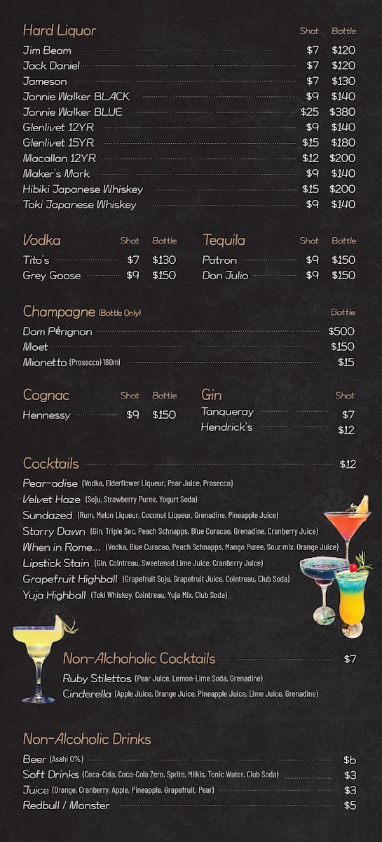 Drinks are a highlight as well, featuring an impressive selection of champagnes, from Mionetto Prosecco to the luxurious Dom Perignon. Whether you're celebrating a special occasion or simply unwinding, the drinks here elevate the experience.